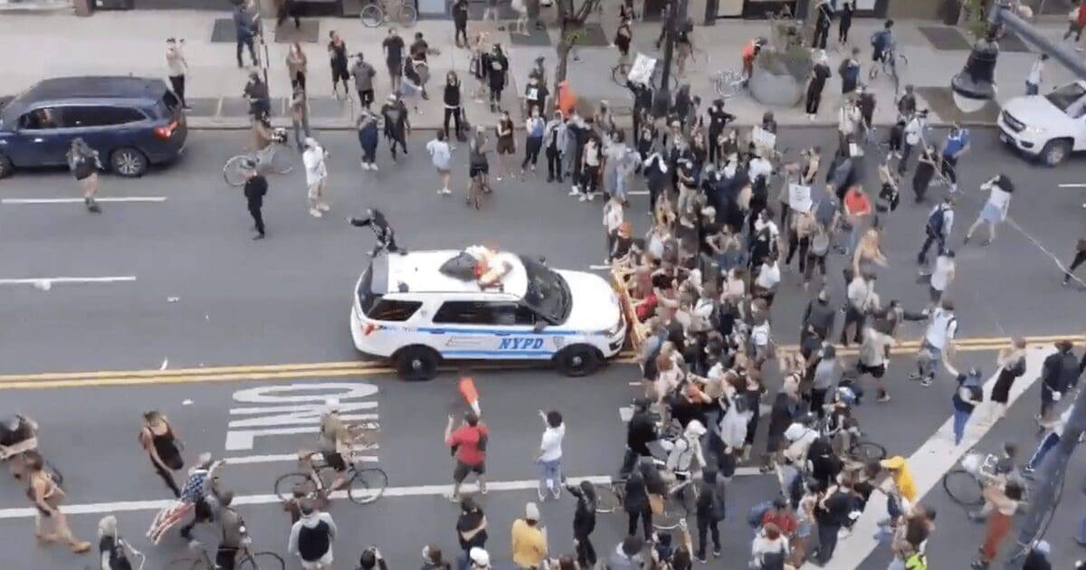 NYPD police cruisers plowing through a riot crowd….errrrrrr, "protesters".