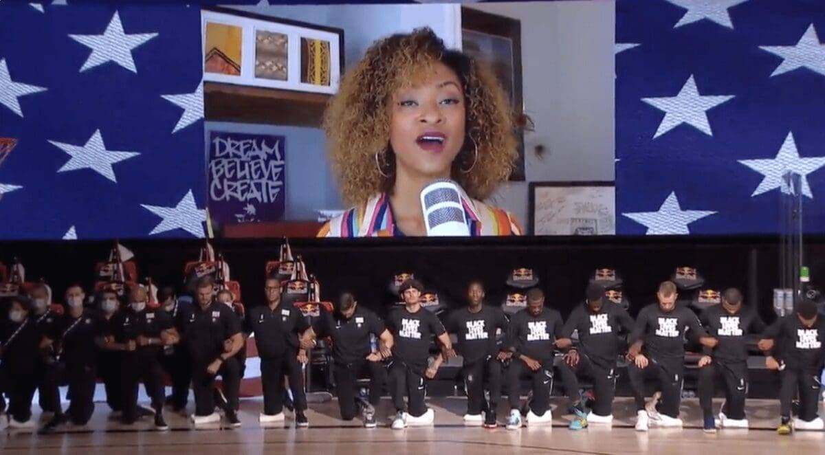 The NBA season restarts and players, coaches, and referees all kneel in solidarity during the National Anthem.