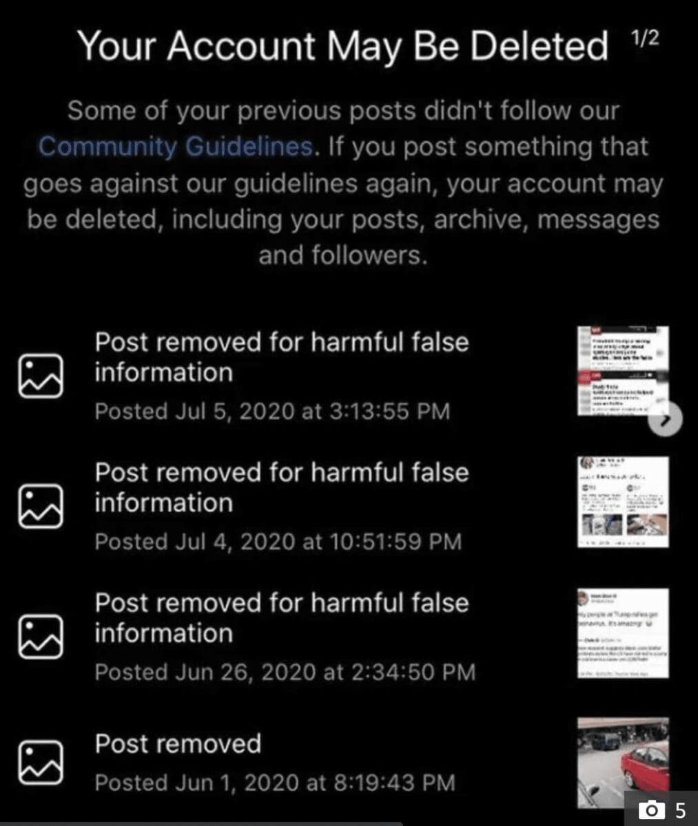 The message shared by Trump Jr indicates that four of the Instagram user in question's posts have been deleted between June 1 and July 5 because it was believed to have "harmful false information."