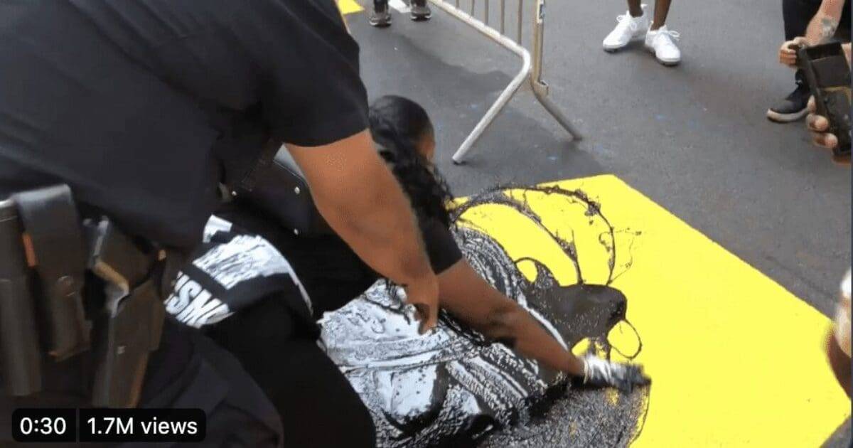 Bystanders shot video of the chaotic scene showing police surrounding a Black woman as she used her hands to spread paint on the mural's bright yellow letters.