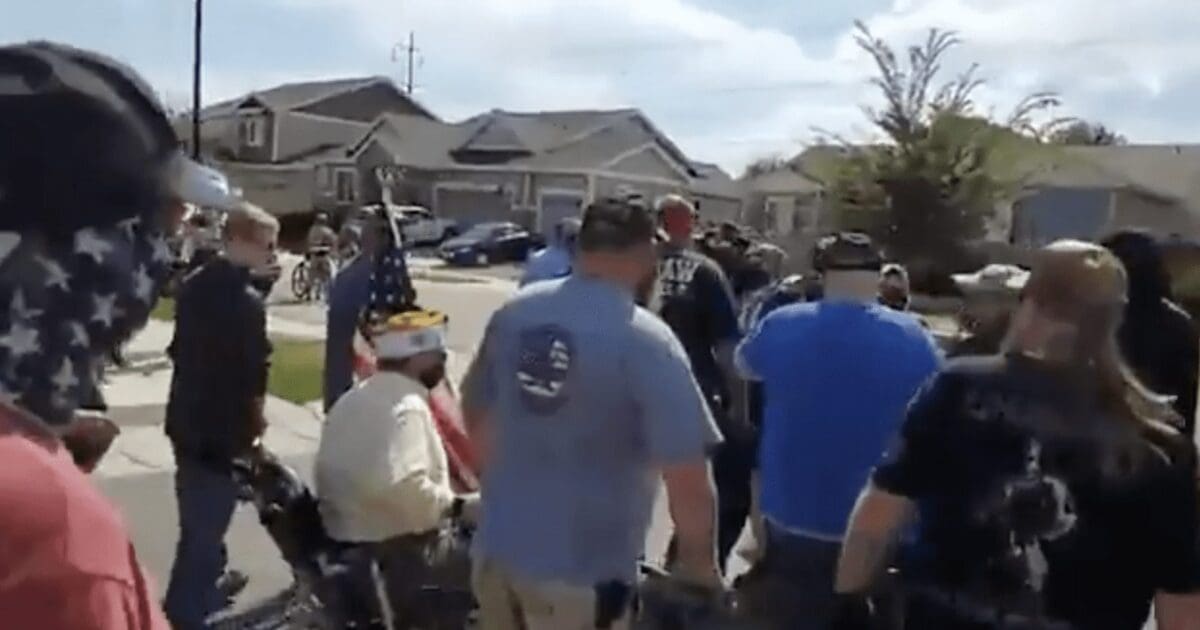 The man who recorded the video said, “So, we are currently marching the Antifa commie bas****s out of the neighborhood because nobody wants Antifa in the neighborhood. Nobody wants them here, so we’re marching them out.”