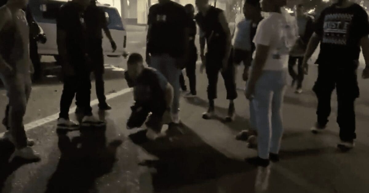 At one point the man on the ground says he was not trying to hurt anyone, and, while kneeling, absorbs several punches because the group was unconvinced that he was telling the truth.