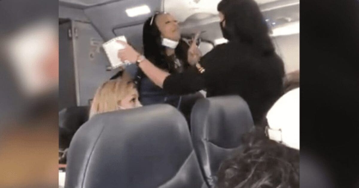 “You have a mask on, you’re in the government, too, you’re confined, and you don’t have White privilege anymore,” the passenger, who has her mask pulled under her chin, says to the flight attendant in the video. “I’m a Queen from California.”