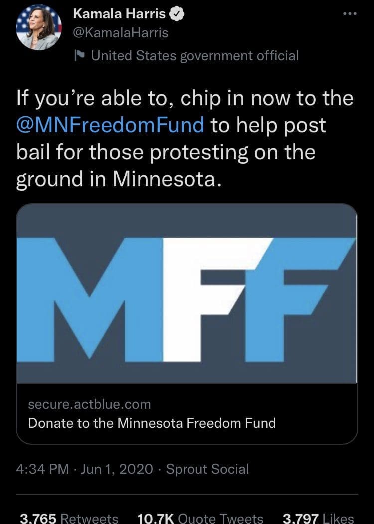 Bailed out by the The Kamala Harris-backed Minnesota Freedom Fund. They know the revolutionaries’ adage: “the worse, the better.” https://t.co/LAjhzNbTLb
