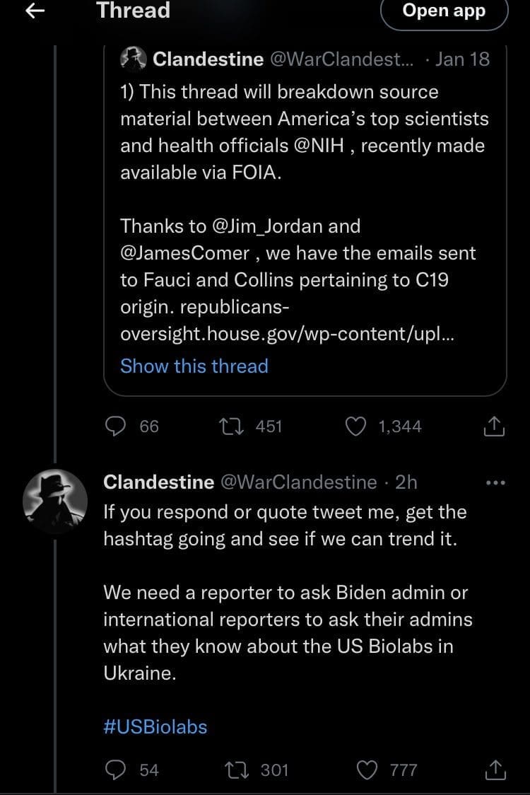 The account that got #USBiolabs trending, @WarClandestine, has been suspended.