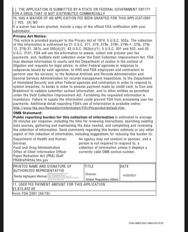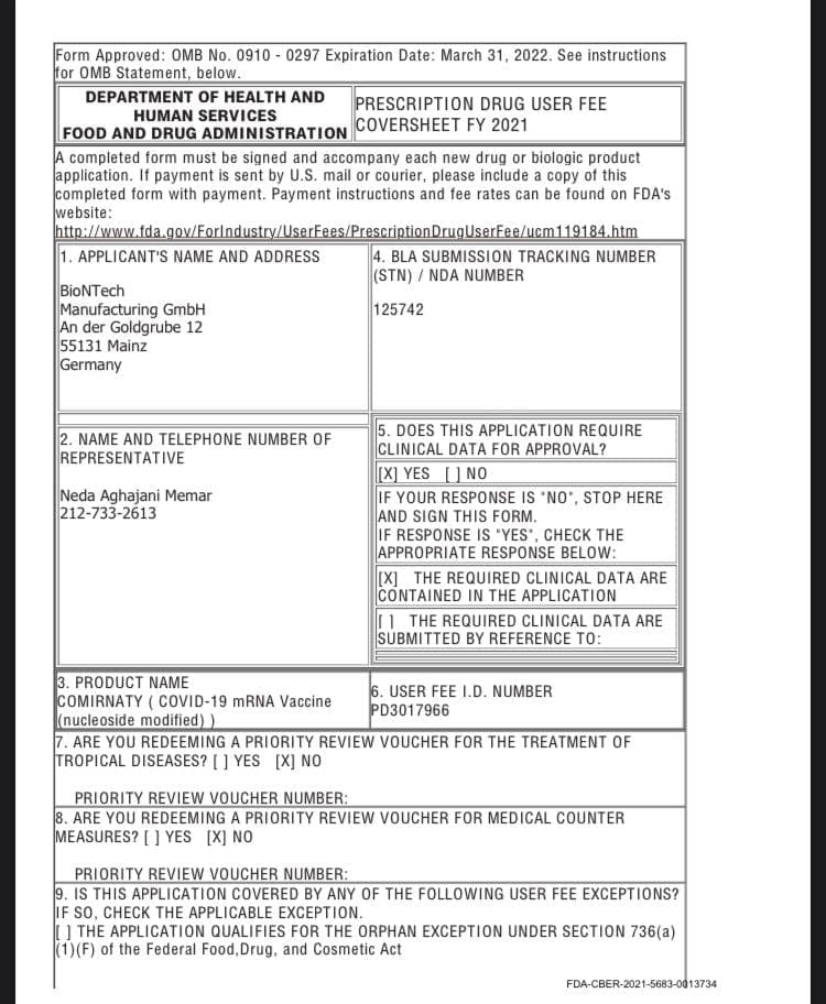 According to the file, BioNTech paid the FDA $2,875,842.00 on 4/20/2021 for the “COMIRNATY COVID-19 mRNA Vaccine.”