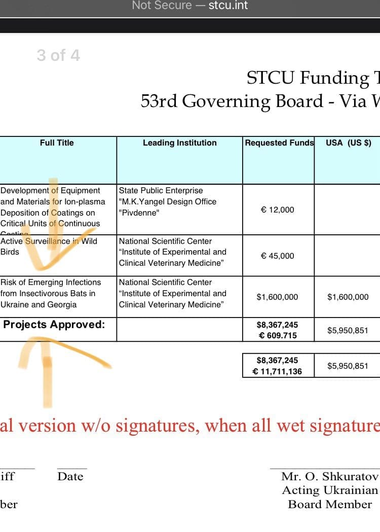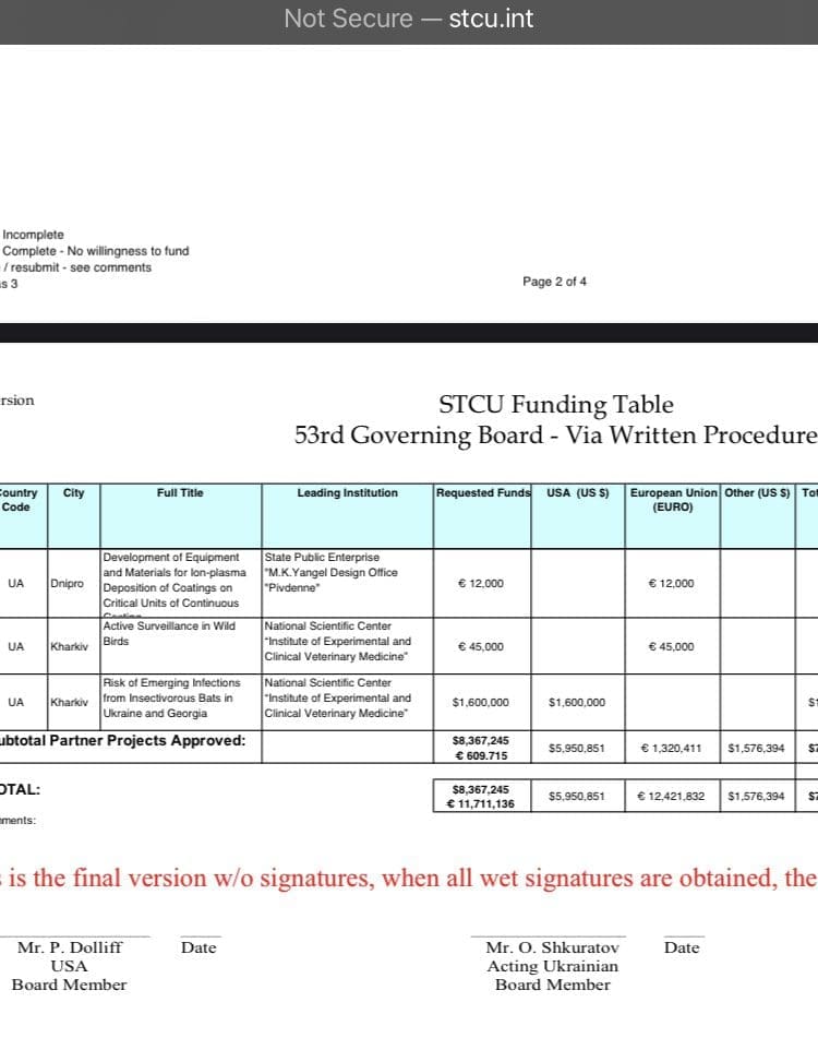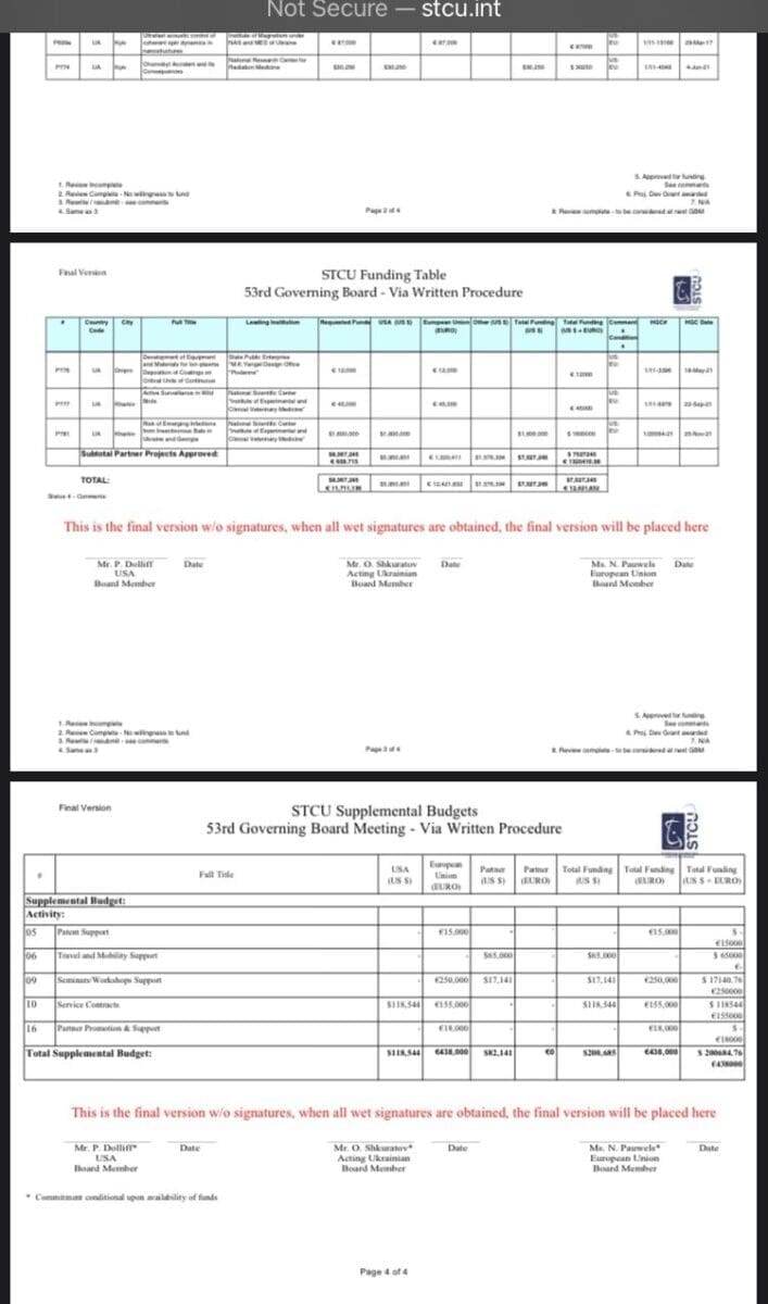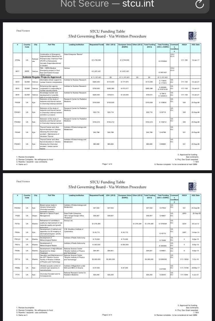 Now, the document in question is the STCU Funding Table – 53rd Governing Board – Via Written Procedure.