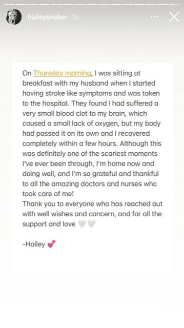 25-year-old Hailey Bieber, wife of singer Justin Bieber and daughter of actor Stephen Baldwin, revealed she went to the hospital after suffering “stroke like symptoms.”