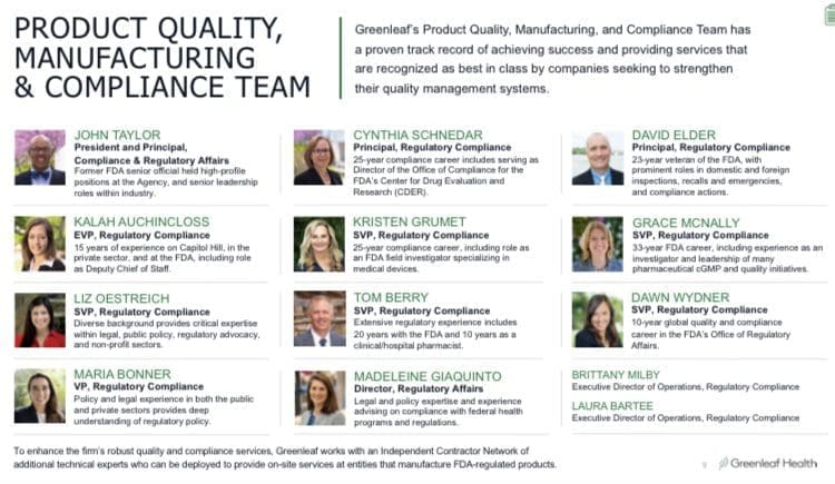 Her bio on Greenleaf Health shows a lengthy government career, including a stint as FDA Deputy Chief of Staff: