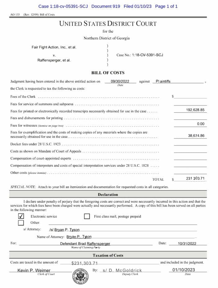 Fair Fight Action must reimburse $192,628.85 in transcription fees and $38,674.86 in copying costs that Georgia incurred to fight the lawsuit.