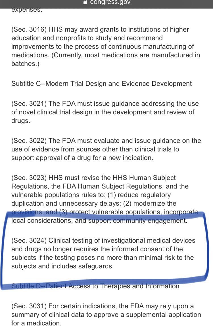 If we review the ‘Cures Act,’ there is one shocking section that eliminates informed consent.