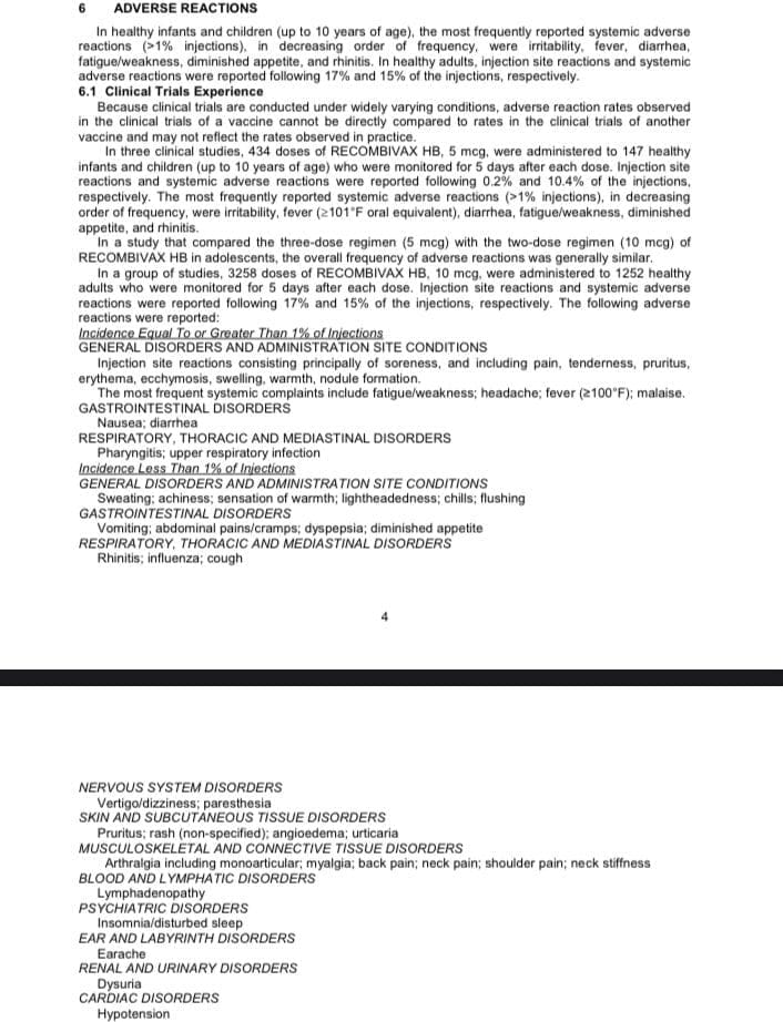 “In three clinical studies, 434 doses of RECOMBIVAX HB, 5 mcg, were administered to 147 healthy infants and children (up to 10 years of age) who were monitored for 5 days after each dose,” Siri showed from a package insert.