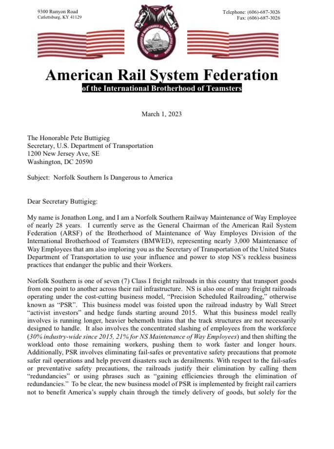 In a strongly worded letter to Gov Mike DeWine entitled "Norfolk Southern's cost cutting business model is dangerous to America," union leader says rail workers are getting sick at the site of the East Palestine derailment cleanup pic.twitter.com/5zxUI0cSuX