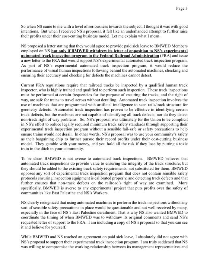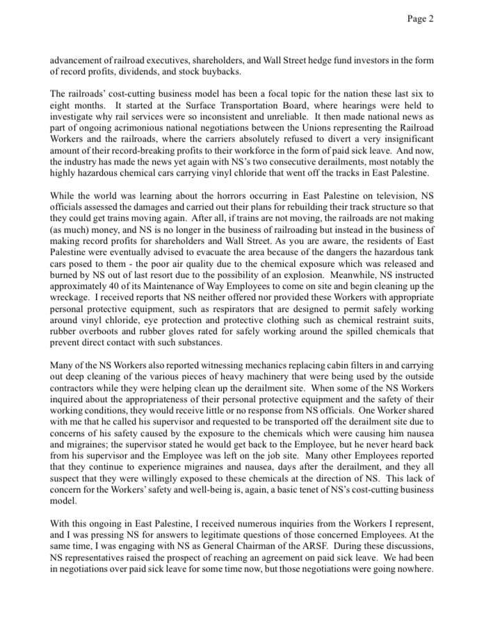 “Many other employees reported that they continue to experience migraines and nausea, days after the derailment, and they all suspect that they were willingly exposed to these chemicals at the direction of NS. This lack of concern for the workers’ safety and well-being is, again, a basic tenet of NS’s cost-cutting business model,” the letter added.
