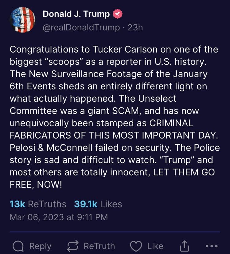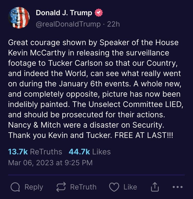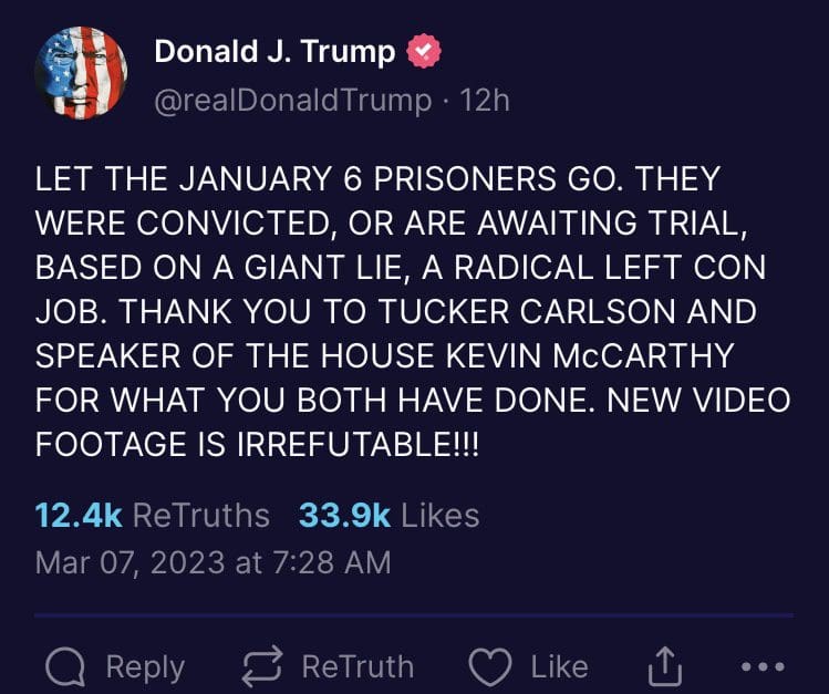 “LET THE JANUARY 6 PRISONERS GO. THEY WERE CONVICTED, OR ARE AWAITING TRIAL, BASED ON A GIANT LIE, A RADICAL LEFT CON JOB. THANK YOU TO TUCKER CARLSON AND SPEAKER OF THE HOUSE KEVIN McCARTHY FOR WHAT YOU BOTH HAVE DONE. NEW VIDEO FOOTAGE IS IRREFUTABLE!!!” Trump posted to Truth Social Tuesday.